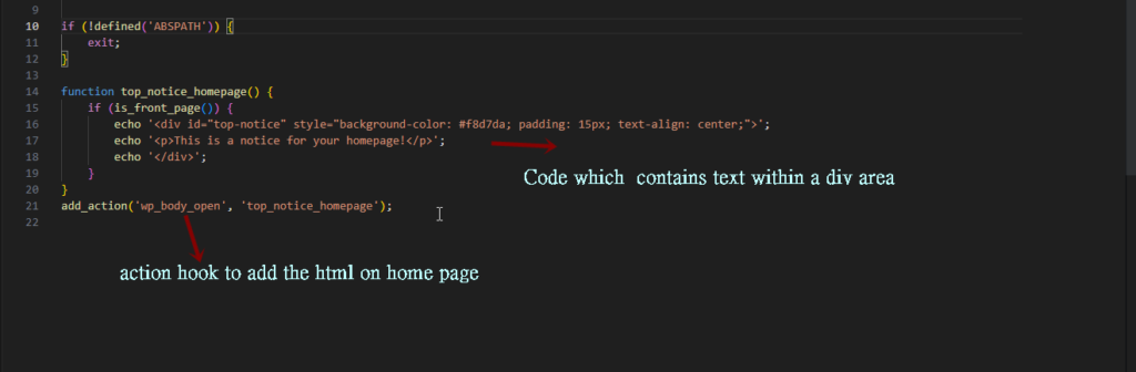 In this function, we define HTML data with the text we want to display as a notice. Whenever we call this function, it returns the HTML notice. To render this notice at the top of the homepage, we use action hooks.