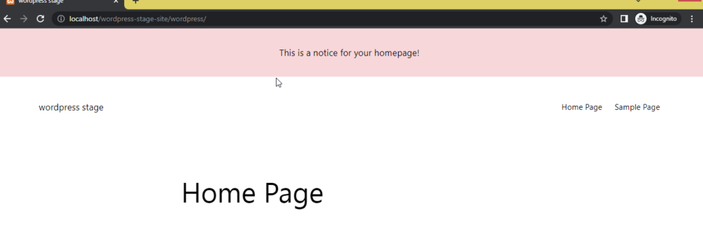 Now we created a function named as top_notice_homepage() and have enclosed it within if block with is_front_page() condition check as shown above in code snippet . The is_front_page