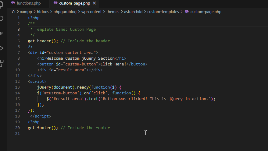 Open custom-page.php page.This is a template page in custom-templates folder.Add the below code to custom-page.php page above get_footer().